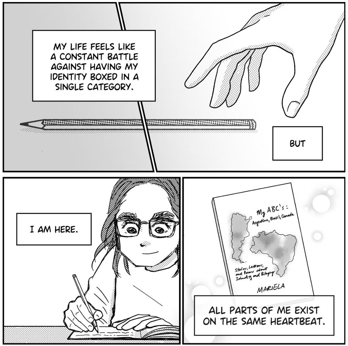 My ABCs: Argentina, Brazil, Canada: Stories, Letters, and Poems about Identity and Belonging explores moments from Mariela Sol Torroba Hennigen's upbringing and family history. She reflects on how they interweave, how both shaped her into who she is and how both brought her to where she stands today. Note that this book mentions mature topics, like xenophobia, bullying, and violence.